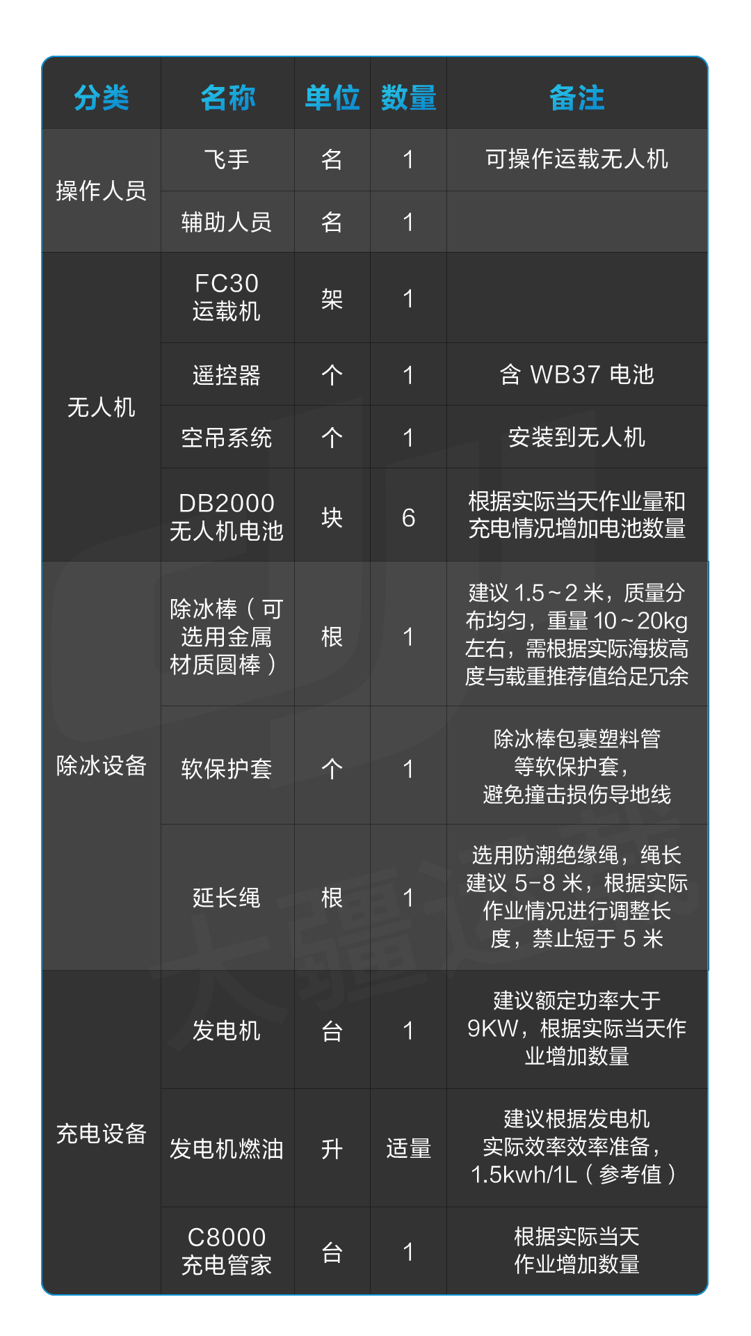 2.防潮绝缘绳和除冰棒总重量须小于当前海拔飞行器最大载重,并给足冗余(5kg以上);