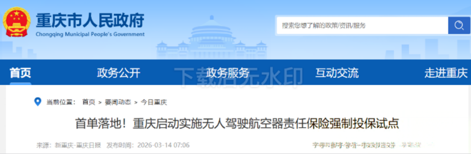 重庆低空经济发展迎来新突破!3月13日,上游新闻记者从重庆市发展改革委获悉,重庆市正式启动无人驾驶航空器责任保险强制投保试点并实现首单突破,航天科技集团航天时代低空科技有限公司旗下194架无人机获4260万元风险保障。 此次试点落地是由重庆市发展改革委、重庆金融监管局、民航重庆监管局统筹推动,重庆无人驾驶航空器第三者责任保险条款已完成备案。该保单由低空经济共保体首席承保人人保财险重庆市分公司联合18家保险机构共同承保,标志着我国低空经济领域责任保险强制投保机制实现“零的突破”,为全国推动低空保险高质量发展贡献了首个实践样本。 重庆高度重视培育低空保险发展生态,聚焦顶层设计与制度创新,2025年8月创新成立全国首个低空经济共保体,12月推动成立风险减量实验室,2026年3月通过在全国率先探索启动无人驾驶航空器责任保险强制投保并自主研发专属条款,不仅有效解决了运营主体“投保难、风险高”的发展瓶颈,更将风险管理深度嵌入了低空经济产业发展的全生命周期。 ▲重庆市发改委供图 据悉,本次签发使用的重庆无人驾驶航空器第三者责任保险条款,是为重庆“超大城市+山地特色”的低空复杂运行场景量身定制的保险新条款。在重庆市保险行业协会、中国银行保险信息技术管理有限公司技术支持下,该保险致力于填补传统商业保险的短板,将空中碰撞、操作失误、突发恶劣天气、通讯链路丢失等低空飞行特有风险纳入保障范畴,以制度创新有效破解了以往低空保险“条款不统一、保障不精准”等难题,构建起更为精细化、专业化的风险保障体系。 据了解,首单系航天科技集团航天时代低空科技公司投保的保险,全面覆盖第三方人身伤亡、财产损失等核心风险,系统化解低空飞行潜在安全隐患。此次项目的签单落地,是重庆推动“政策引导、保险护航、企业自律”协同风险防范模式的重要里程碑。 下一步,重庆将持续完善低空经济配套政策与体制机制,为全国层面健全低空经济责任保险强制投保制度提供可复制、可推广的经验借鉴,全力护航低空经济新质生产力高质量发展。