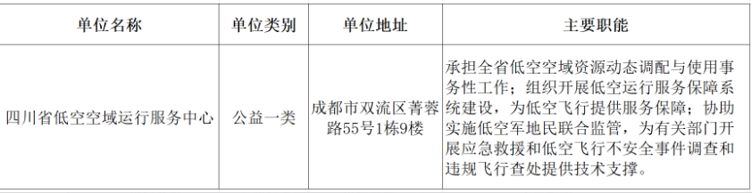 四川省低空空域运行服务中心是四川省委军民融合办下属公益一类事业单位,承担全省低空空域资源动态调配与使用事务性工作;组织开展低空运行服务保障系统建设,为低空飞行提供服务保障;协助实施低空军地民联合监管,为有关部门开展应急救援和低空飞行不安全事件调查和违规飞行查处提供技术支撑。
