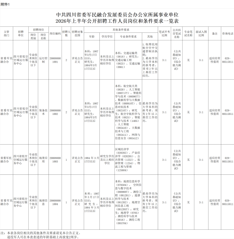 面向全国招聘2026年7月31日前取得国民教育相应学历和学位,并完全符合《中共四川省委军民融合发展委员会办公室所属事业单位2026年上半年公开招聘工作人员岗位和条件要求一览表》(以下简称《岗位和条件要求一览表》)相关岗位条件要求和本公告其他要求的人员。