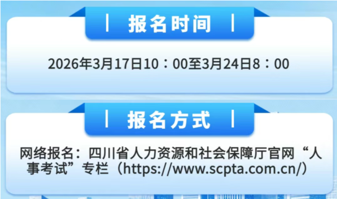 本次招聘采取网络报名方式。报名时间为2026年3月17日10∶00至3月24日8∶00。报名网站为四川省人力资源和社会保障厅官网“人事考试”专栏(https://www.scpta.com.cn/)。